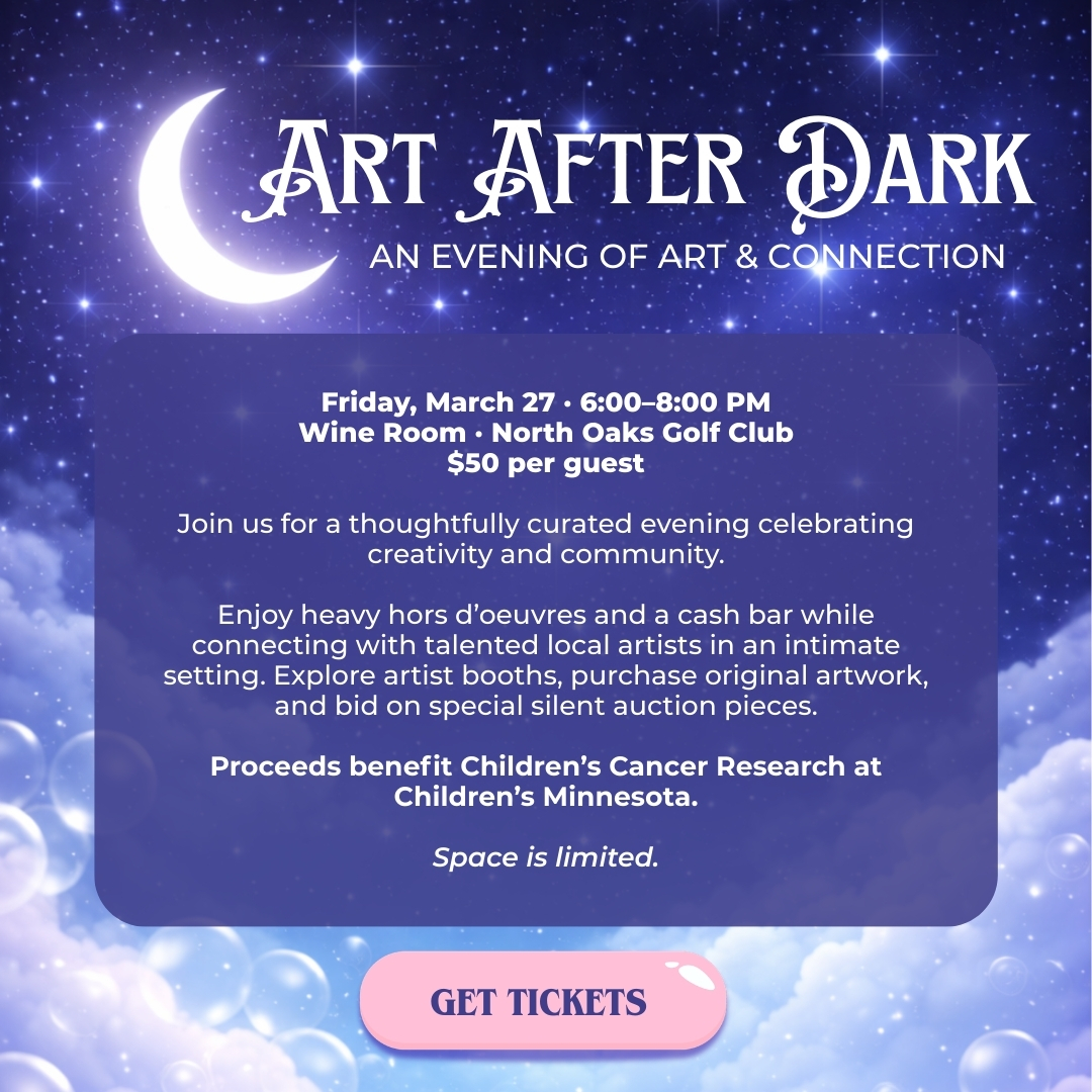 Please join us for this free art exhibition and sale at the North Oaks Golf Club (54 East Oaks Rd, North Oaks), featuring a diverse collection of work by talented and well-known artists throughout Minnesota. A portion of all art sale proceeds will directly support Children’s Cancer Research at Children’s Minnesota.